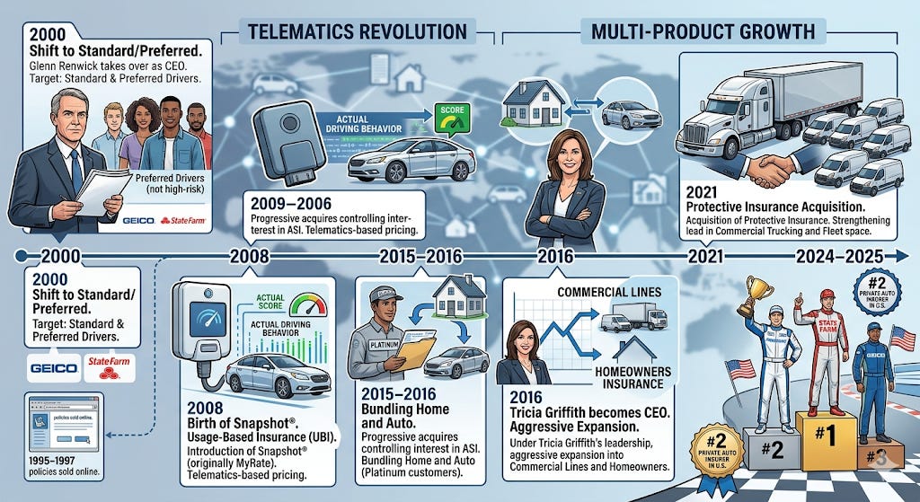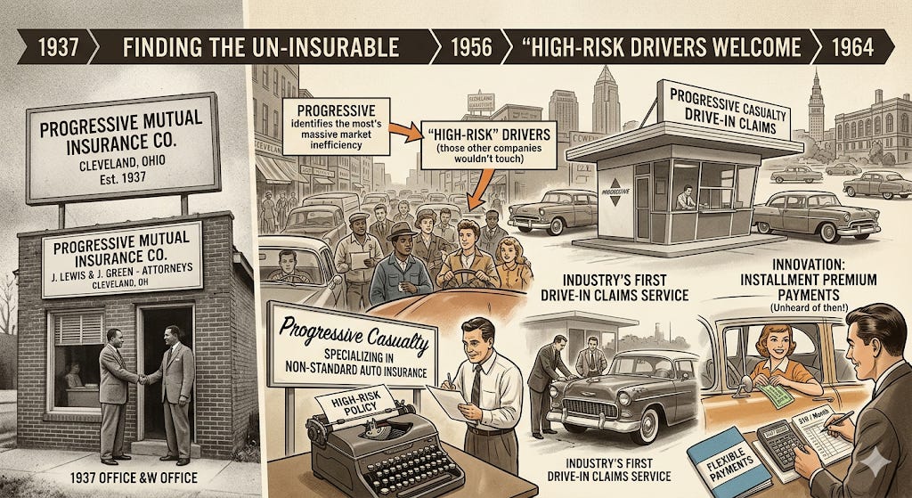 1956: The company identifies a massive market inefficiency: “high-risk” drivers. They form Progressive Casualty specifically to write “non-standard” auto insurance—drivers other companies wouldn’t touch.